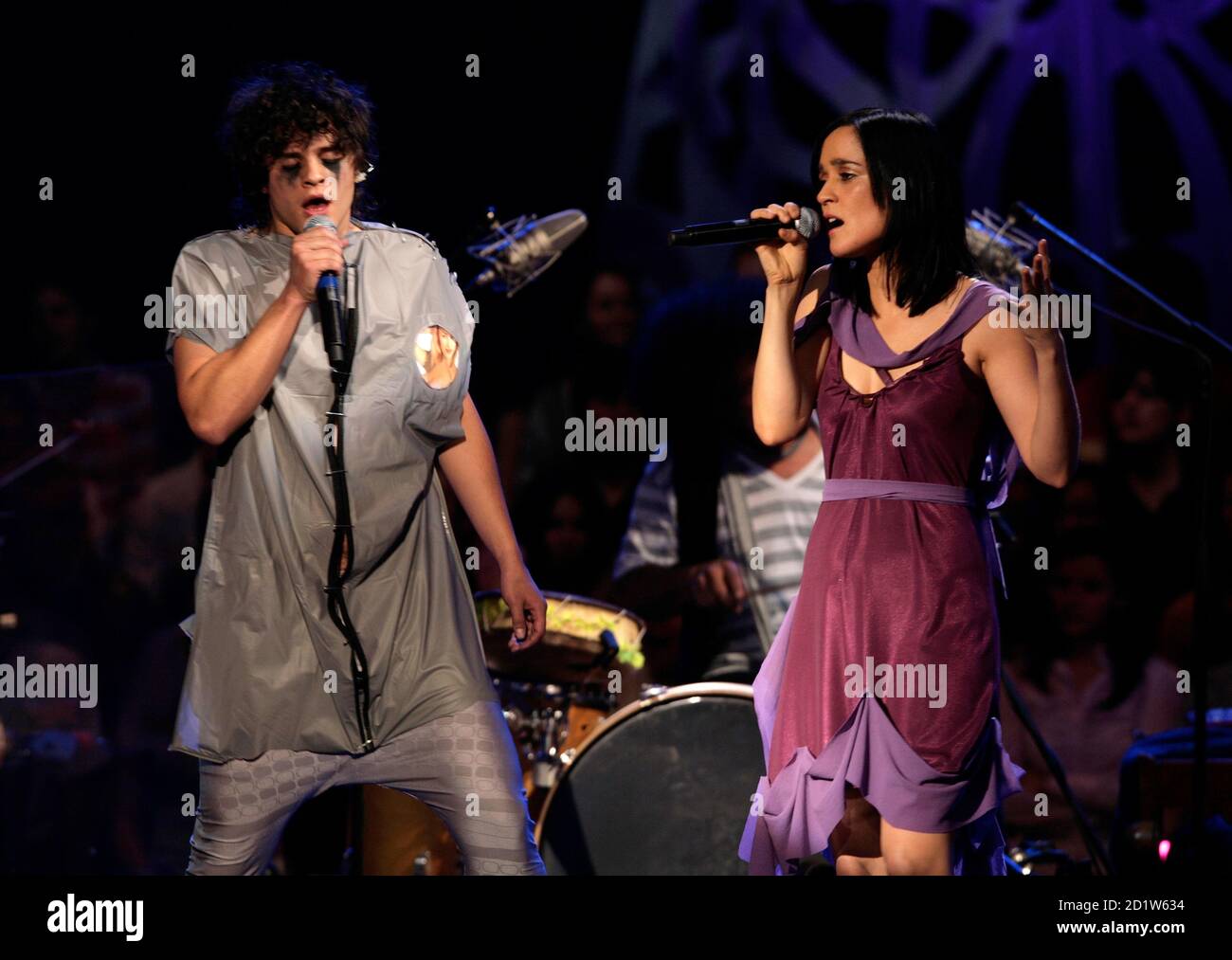 Die Mexikanische Sangerin Julieta Venegas R Tritt Mit Dem Porter Bandsanger Juan Carlos Son Wahrend Eines Mtv Unplugged Konzerts In Mexiko Stadt Am 6 Marz 2008 Auf Reuters Daniel Aguilar Mexiko Stockfotografie Alamy